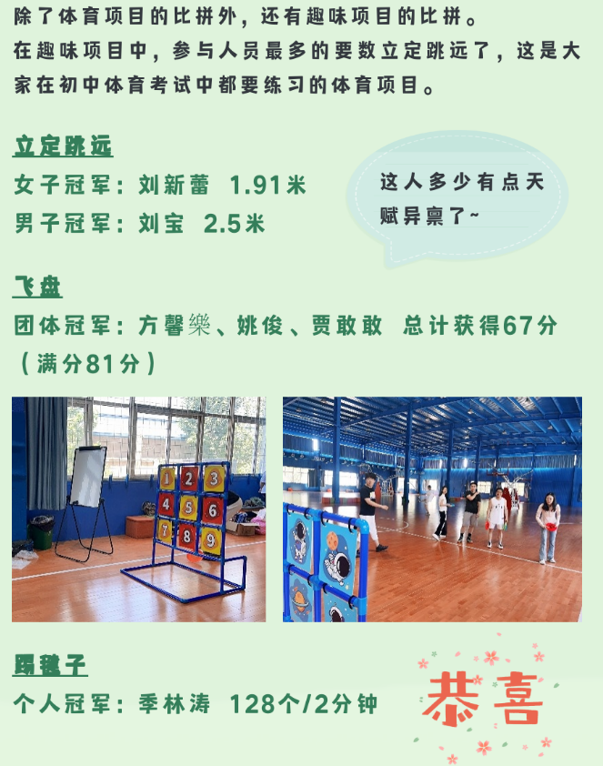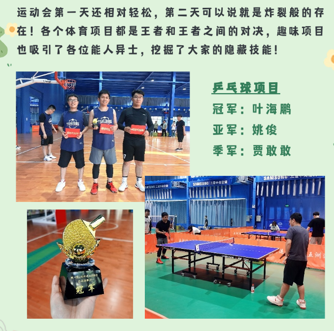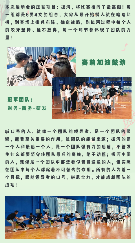 本次運動會在歡樂的氛圍中激發(fā)了大家的潛力,發(fā)現(xiàn)了大家不為人知的潛在技能,讓大家實實在在感受到了團隊的力量,在一聲聲加油中,挑戰(zhàn)自我極限!